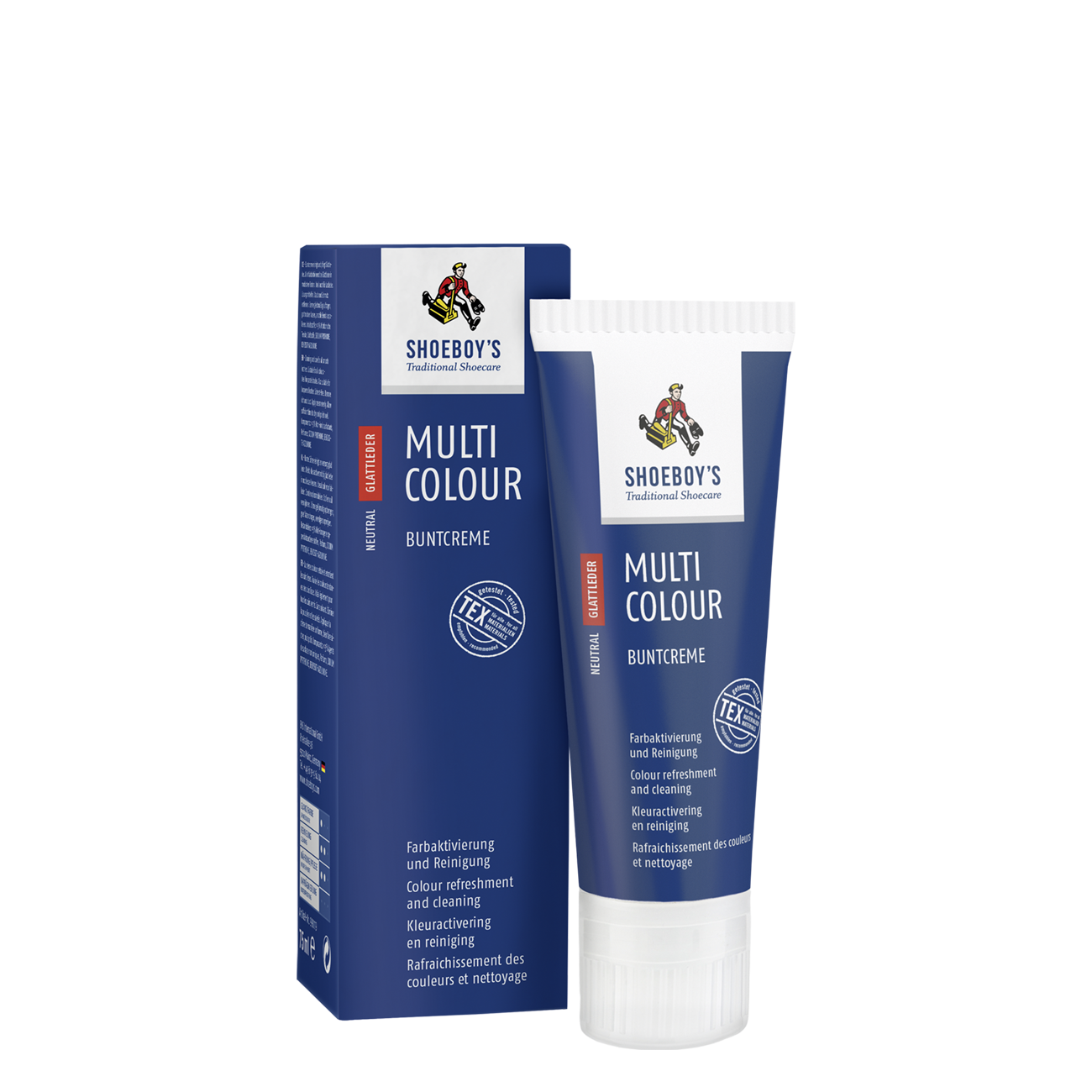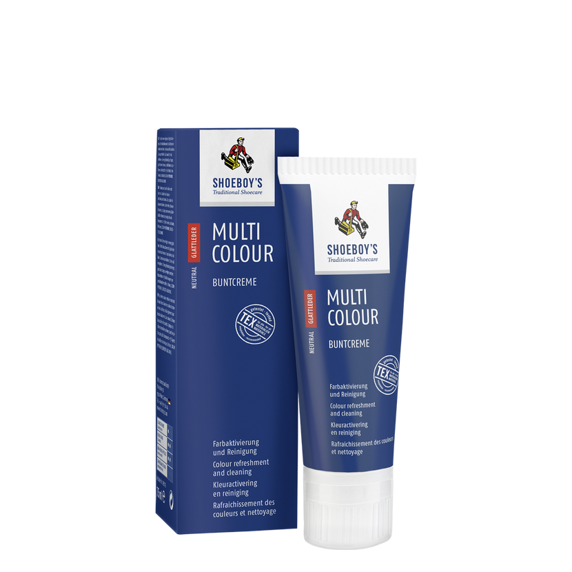 MULTI COLOUR CREAM Cleaning and care for all smooth leathers. Suitable for all colours - ideal for pastel shades. Also suitable for lacquered, patent leather. Solvent-free. APPLICATION: Remove dirt and dust. Apply cream evenly. Allow sufficient time to dry and polish well.