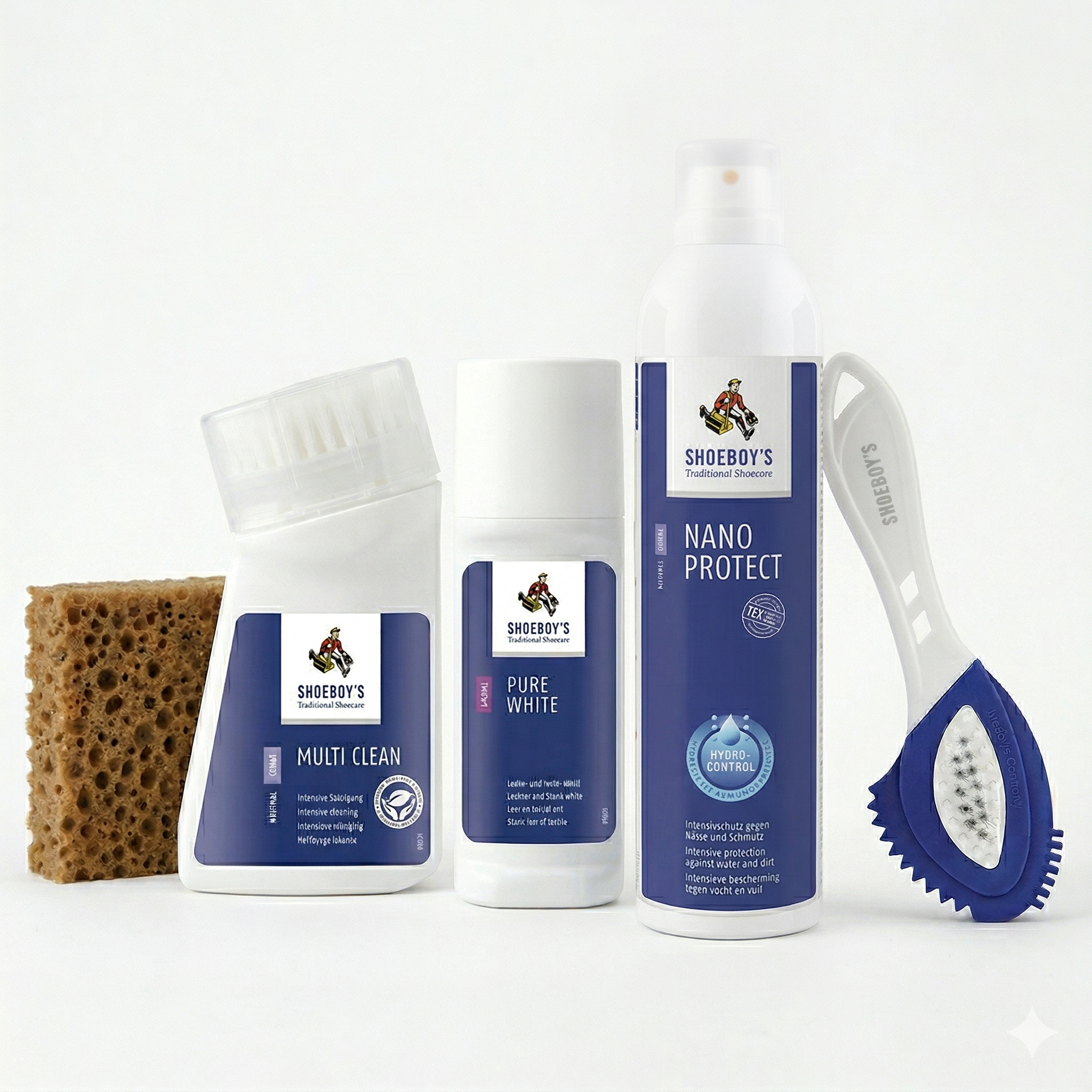 poté opláchněte houbičkou namáčenou v čisté vodě a setřete zbytky čističe SHOEBOY'S MULTI CLEAN pryč z povrchu a nechte dokonale uschnout, nejlépe přes noc